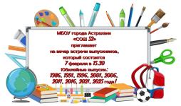 МБОУ г.Астрахани "СОШ №52" приглашает Вас на вечер встречи выпускников, который состоится 7 февраля в 15.30. В актовом зале.